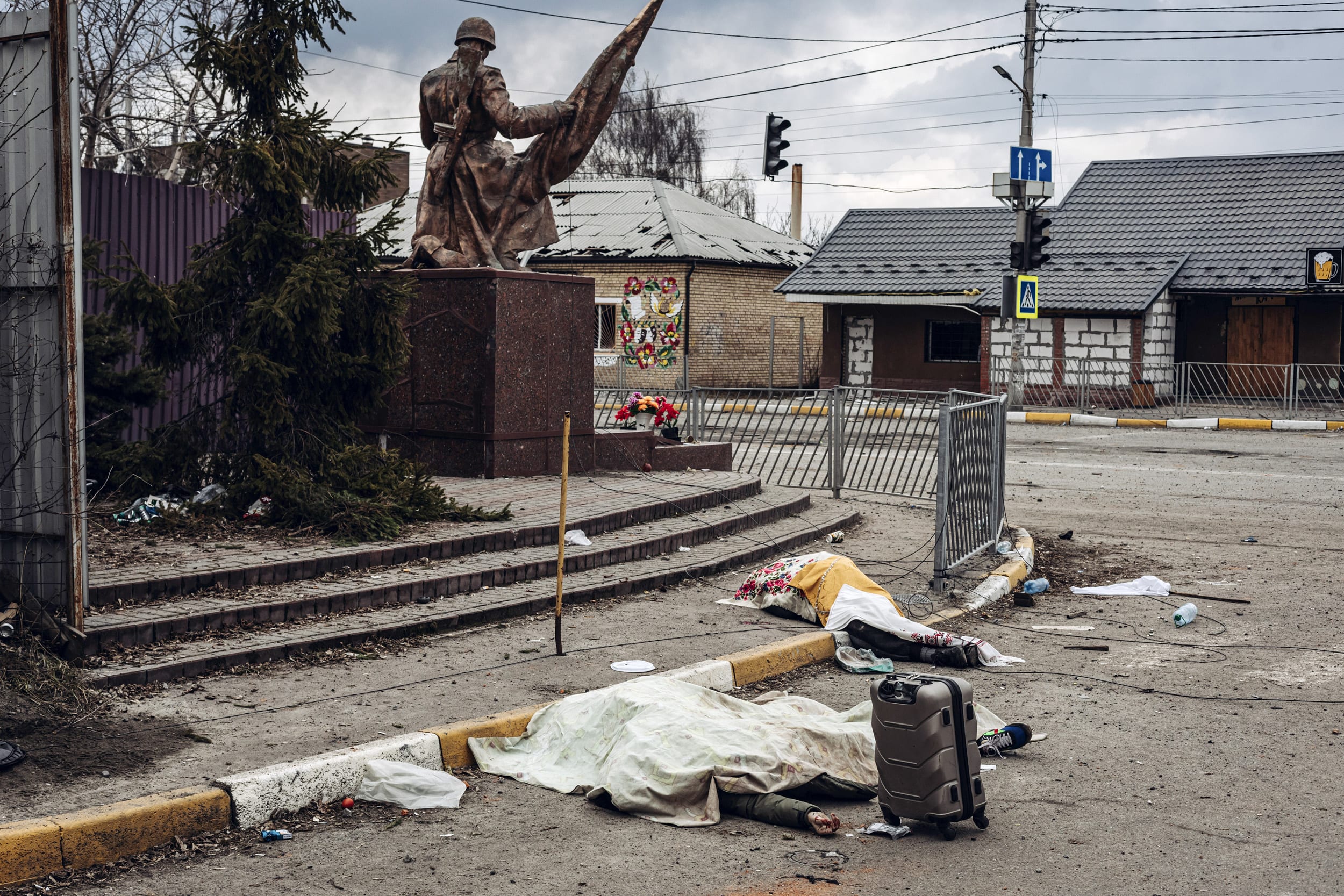 The dead bodies of civilians killed by Russian shelling lie covered in the street in the town of Irpin, Ukraine on Sunday.