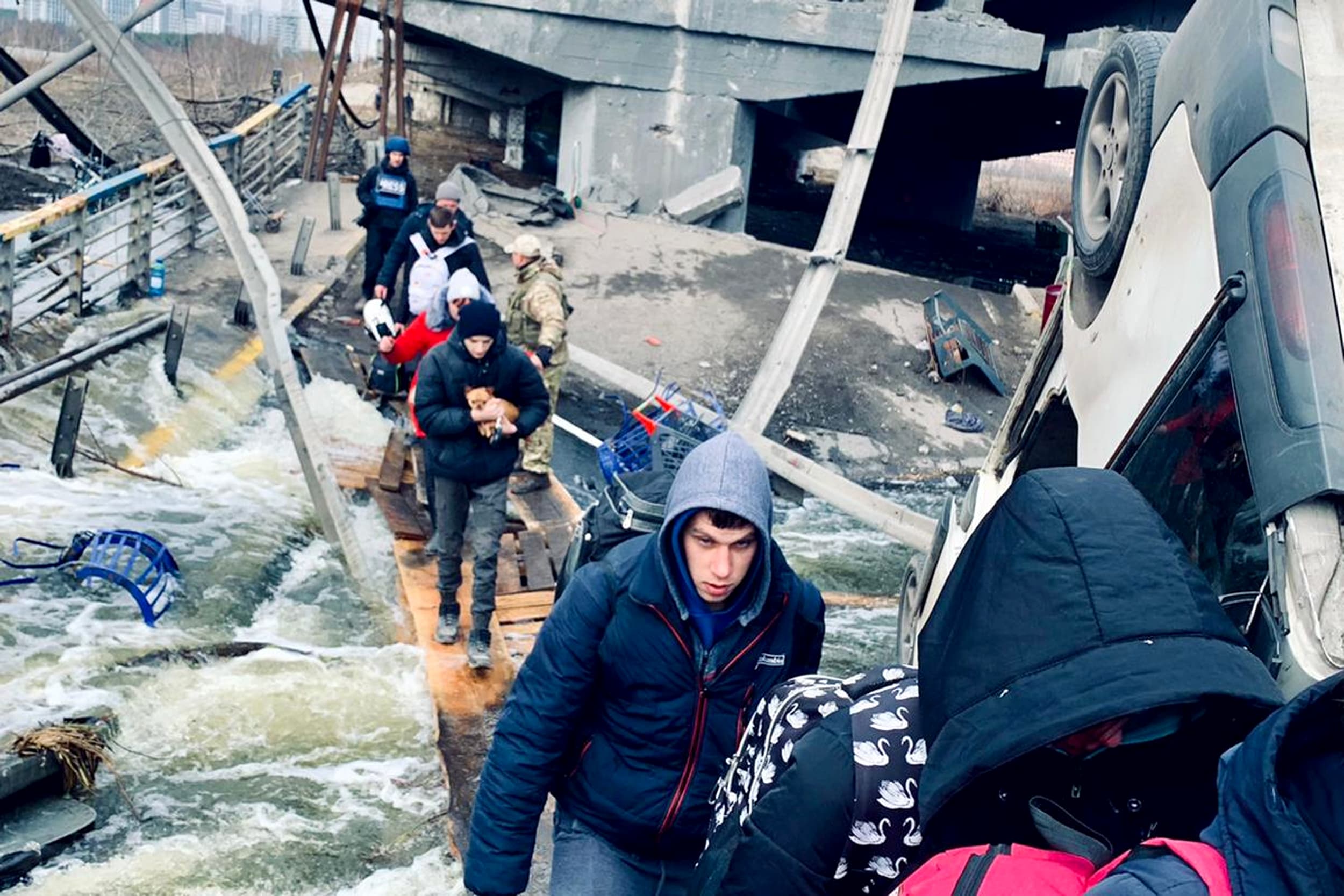 This dramatic video captured the moment Russian mortar shells were fired near the bridge used by people fleeing the fighting in Irpin, Ukraine, on Sunday.