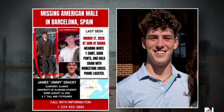 The family of 20-year-old James Paul Gracey, a University of Alabama student who was reported missing after last being seen at a nightclub in Barcelona, is pleading for help in the search for the missing American. Family and friends were alerted of Gracey's disappearance after authorities got ahold of the student's phone, which had been found. March 18, 2026