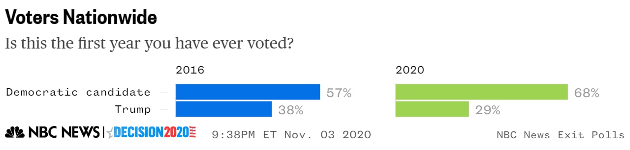 Today, 68 percent of those who say they are voting for the first time cast a ballot for Biden; just 29 say they voted for Trump.