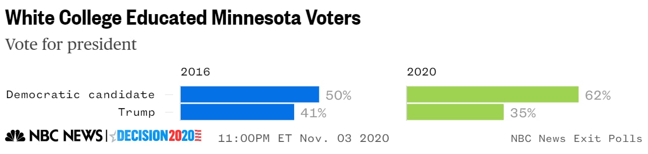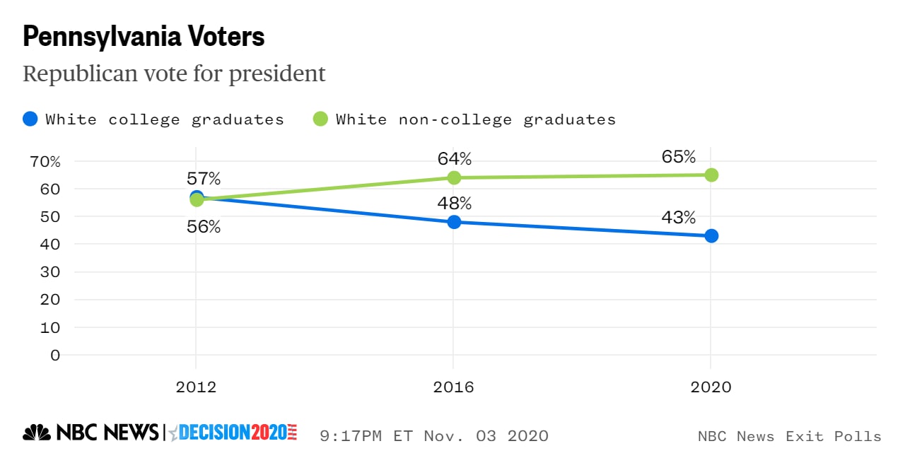 In 2016, Trump toppled the "blue wall" of Pennsylvania, Michigan and Wisconsin by running up the numbers with white voters who do not have college degrees. According to the 2020 NBC News Exit Poll of early and election day voters in Pennsylvania, Trump is maintaining his support of non-college whites but losing ground with white voters who have college degrees.