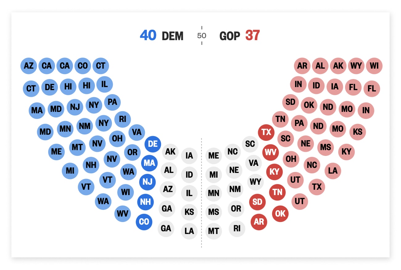Democrats have maintained four seats: New Jersey, Massachusetts, New Hampshire and Delaware. The party picked up a seat in Colorado, the first flip of the night.