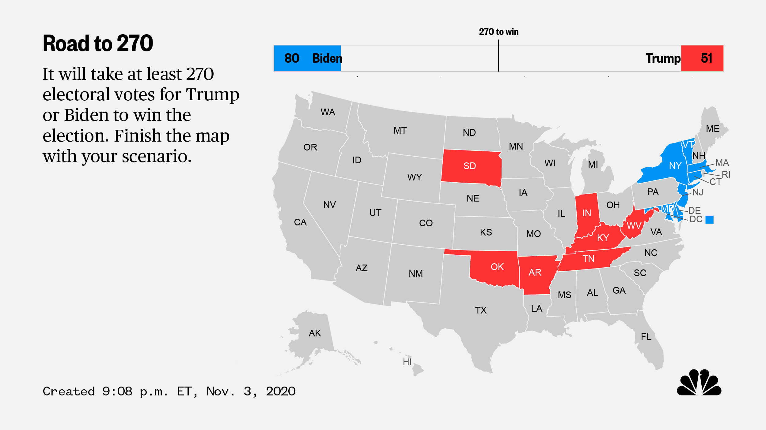 As of 9 p.m. on the East Coast, Biden now holds an 80 to 48 advantage over Trump in electoral votes. It takes 270 to win.