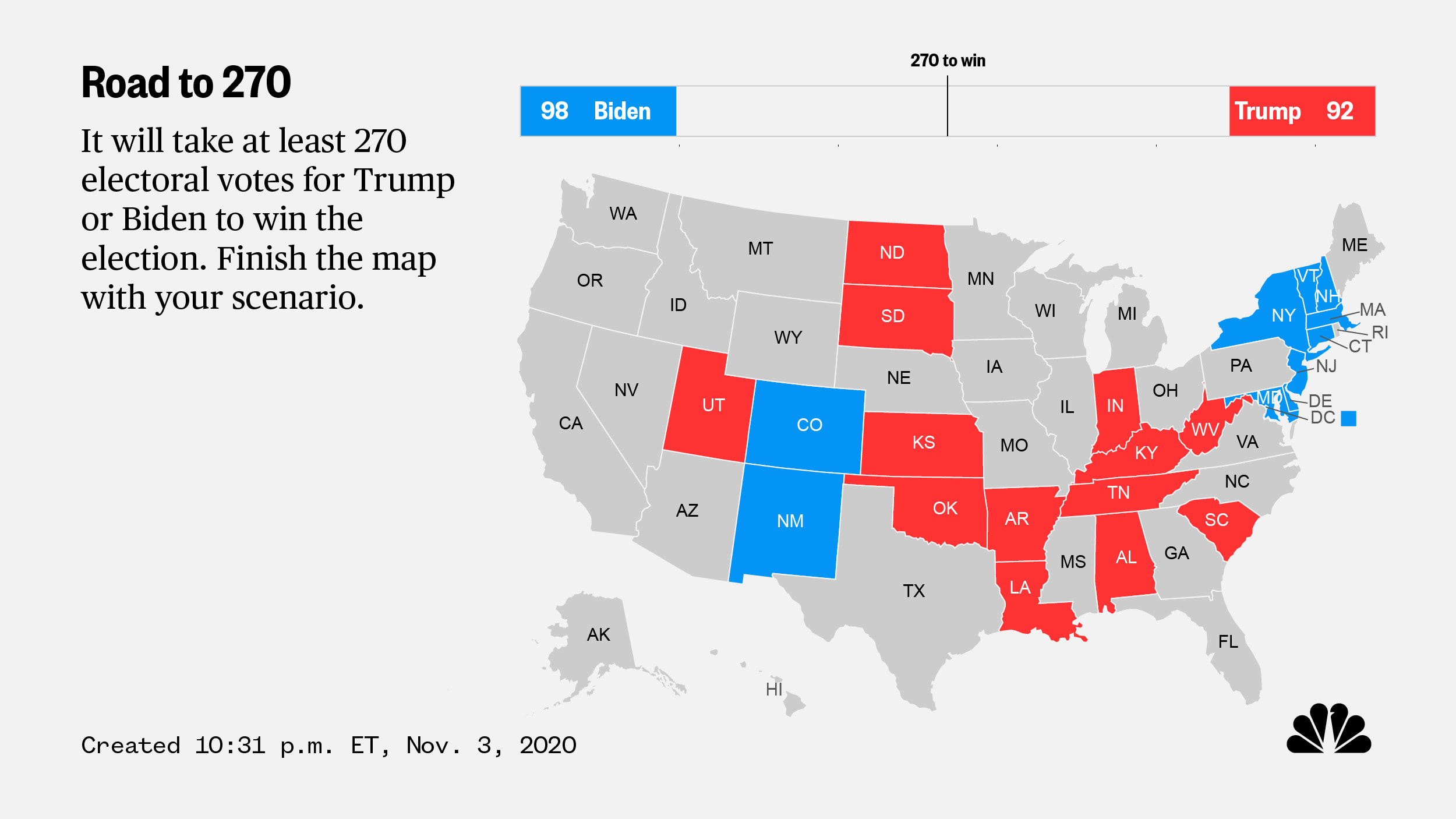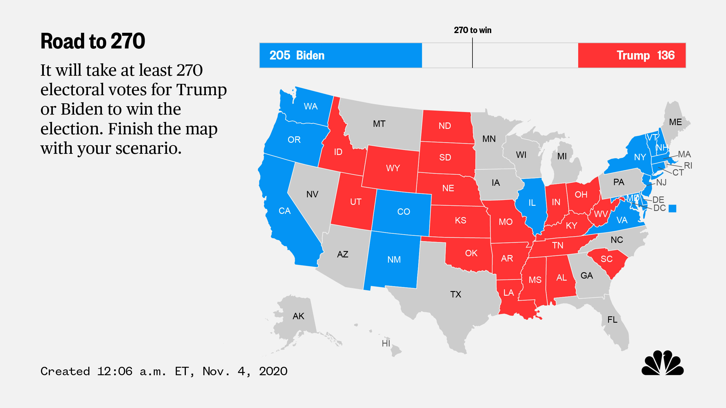 As it stands, Biden currently holds a 224 to 213 lead in the Electoral College over Trump. It takes 270 electoral votes to win.