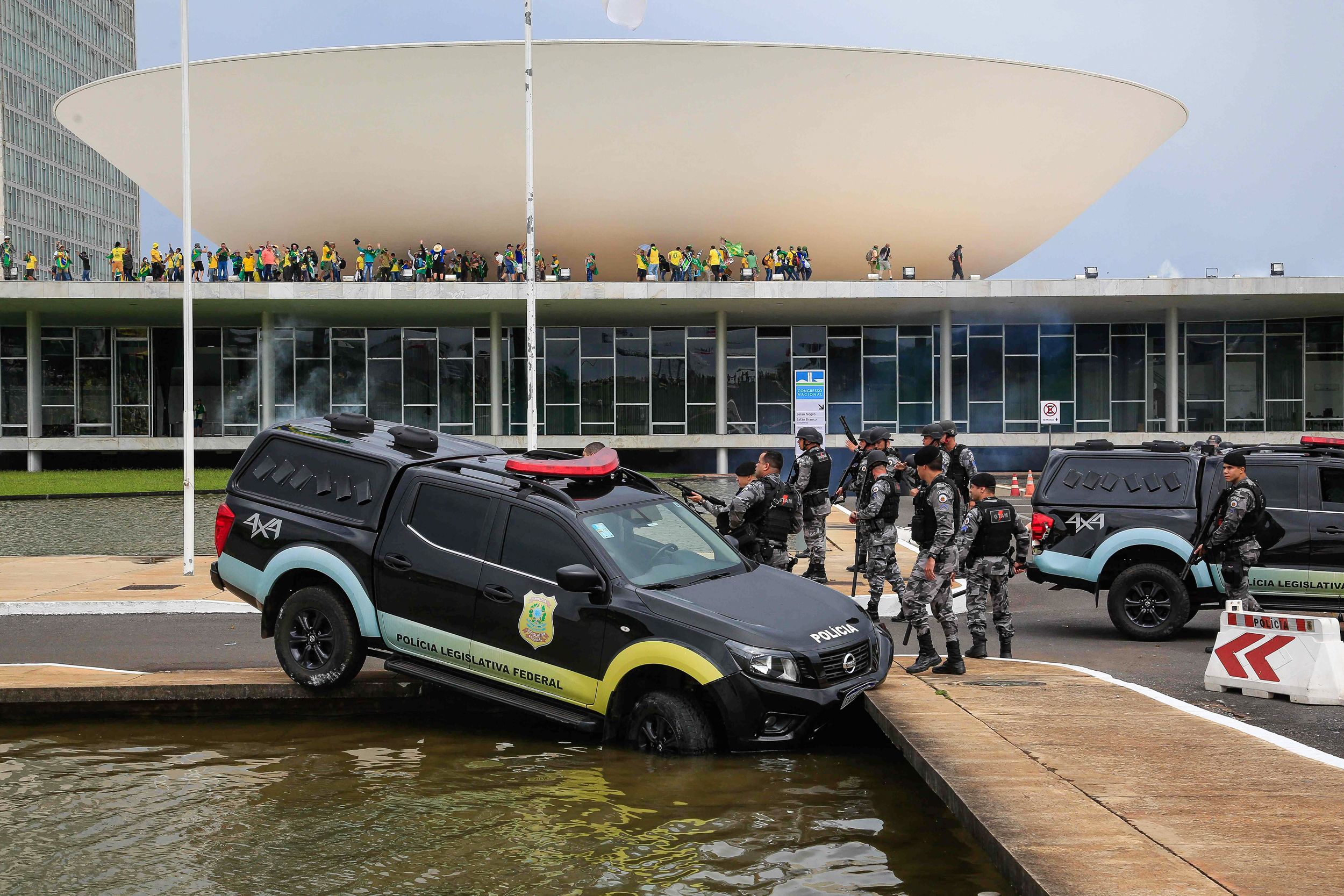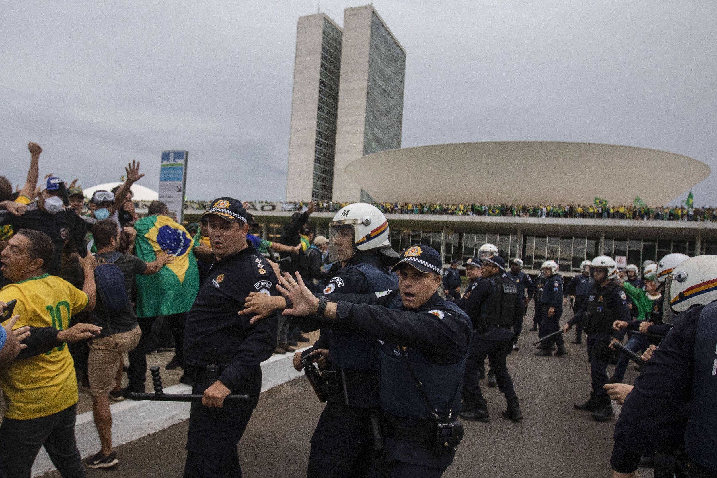 The protesters, who refused to accept Bolsonaro's loss, climbed onto the roofs of the House of Representatives and Senate buildings. (Eraldo Peres / AP)