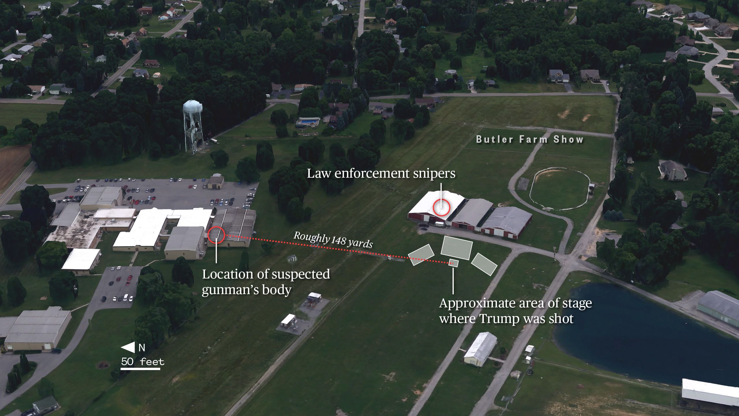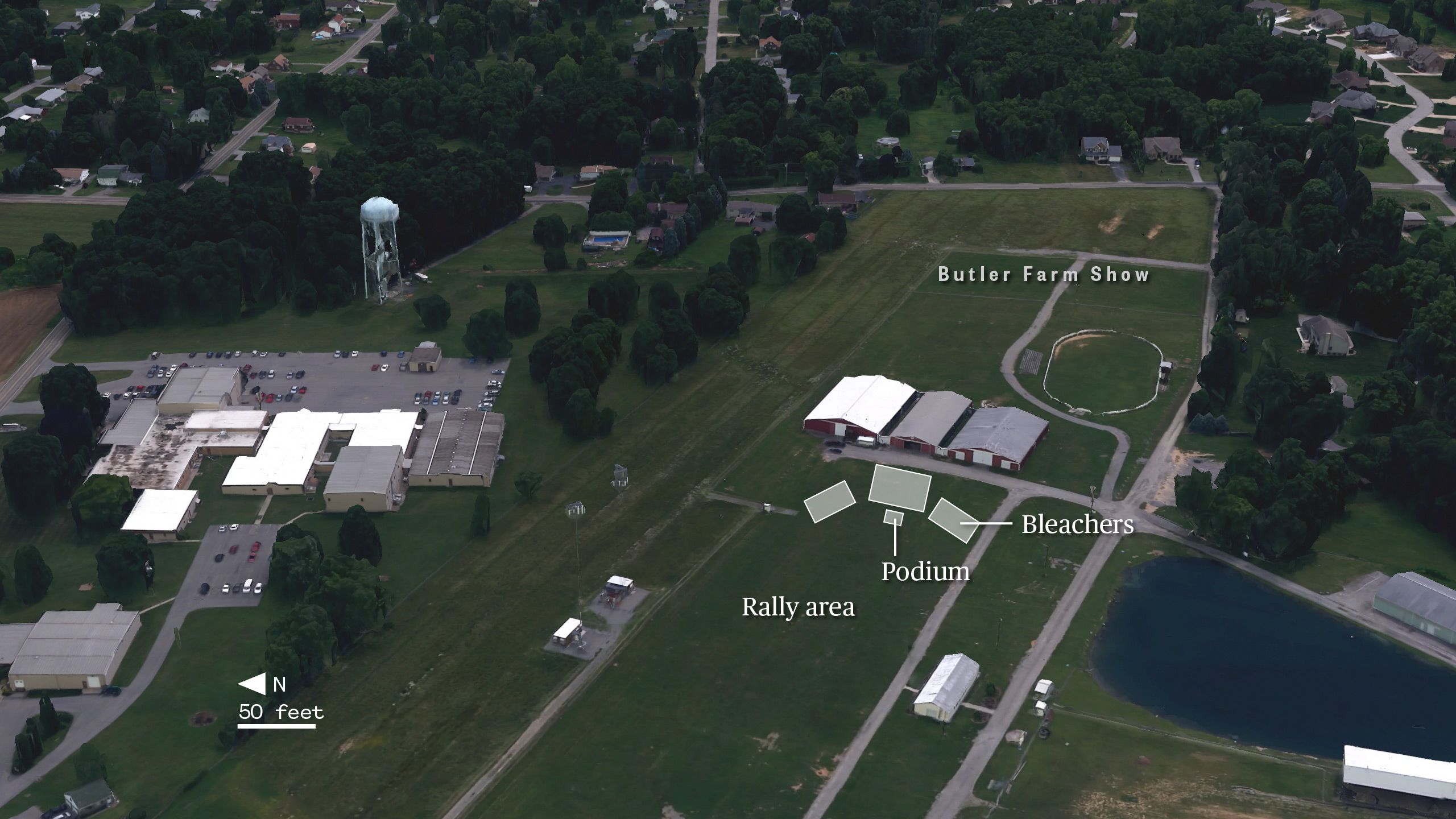 Butler Farm Show, a fairground, played host to the rally with bleachers surrounding a stage where Trump would speak and most attendees on a lawn. There's a small lake on one side and buildings on the other.
