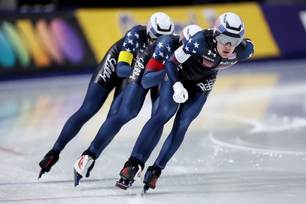 From left, Ethan Cepuran, Emery Lehman and Casey Dawson of the U.S. compete in men's team pursuit during the ISU World Cup speedskating event in Kearns, Utah, on Nov. 16. Matthew Stockman / International Skating Union via Getty Images